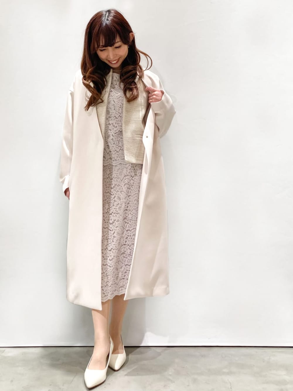じゅん 150cm オケージョンシーンに最適なレース×ツイードの上品で華やかさのあるセレモニースタイル。 ノーカラーコートはドロップショルダーなので肩回りにゆとりがあり、ジャケットの上にもラクに羽織れます♪