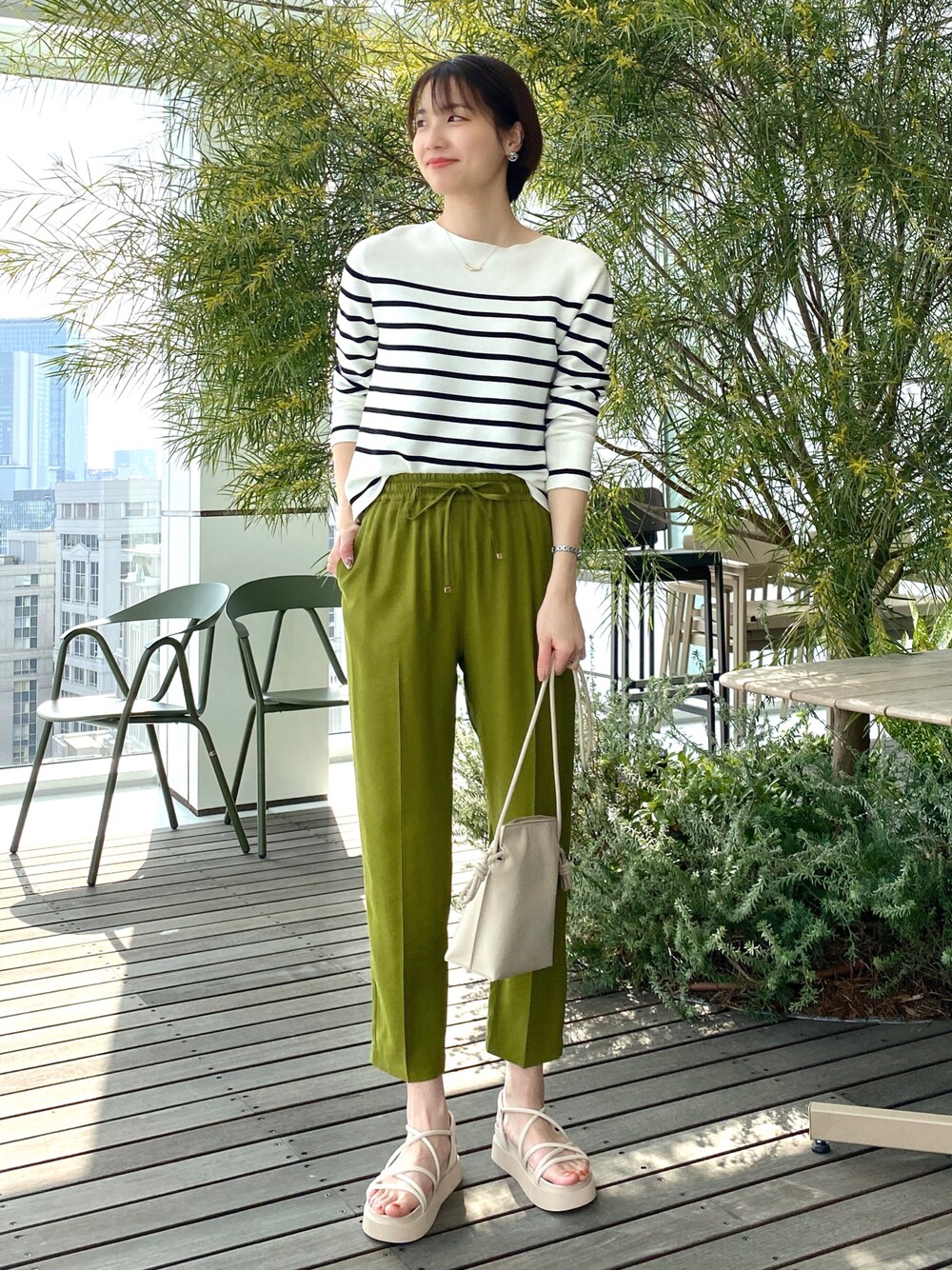 sachiko 174cm 大人気のオーガニックコットンニット。 ボートネックでゆるっとサイズ感が1枚で様になる。 印象的なイエローグリーンのパンツでカジュアルでラフな春コーデに。