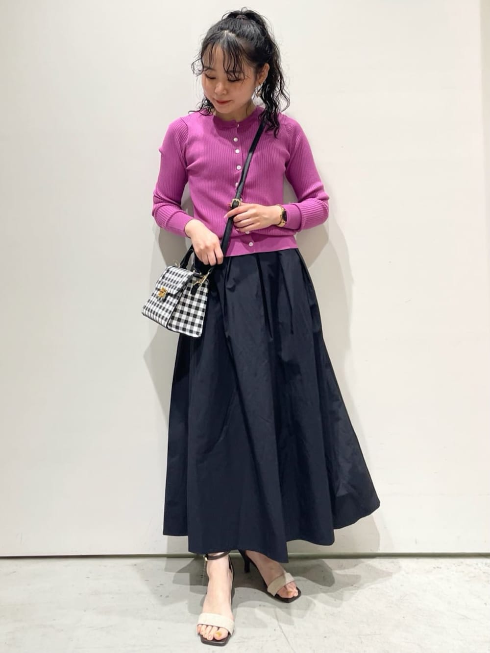 aya 151cm ちゅるんとした立体的なボタンがかわいいカーディガンを全閉めでトップスとして着ました^ - ^ コットン×ナイロン素材のスカートは、ほどよいハリ感とボリュームで女性らしいアイテムです! 光沢があるので黒でも重たくなりません⭐︎ ギンガムチェックのバッグもポイントです。