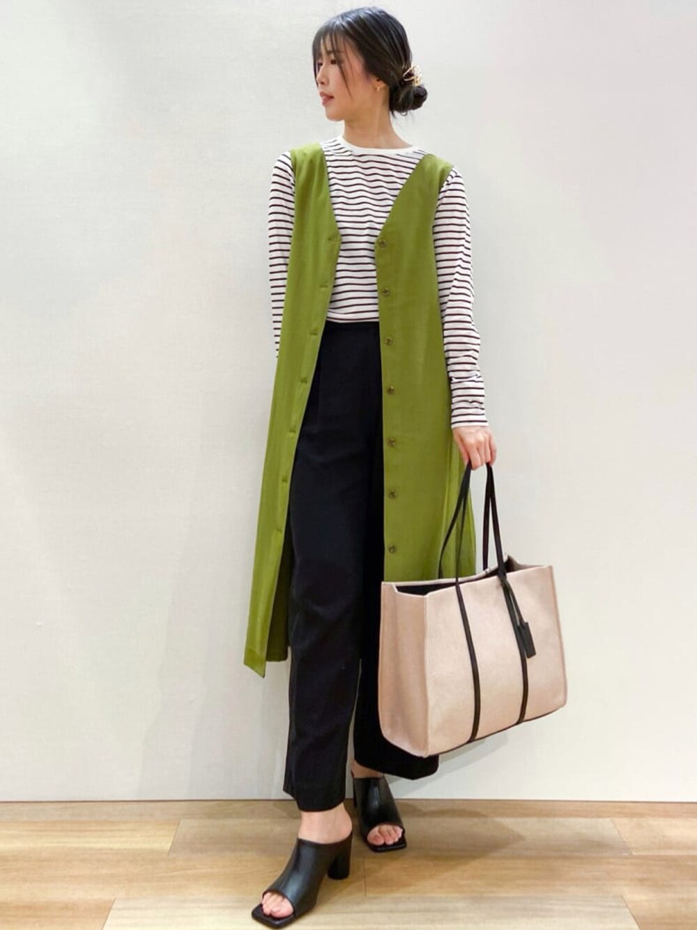 みかん 173cm 3wayで使える超優秀ジャンパースカート!!程よい落ち感と光沢感がオトナな印象です♪前後どちらでも着ていただけ、ボタンを開けてロングジレとしても使えます!今時期から夏まで使えていろんなコーデが楽しめる一枚です☺︎