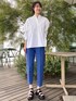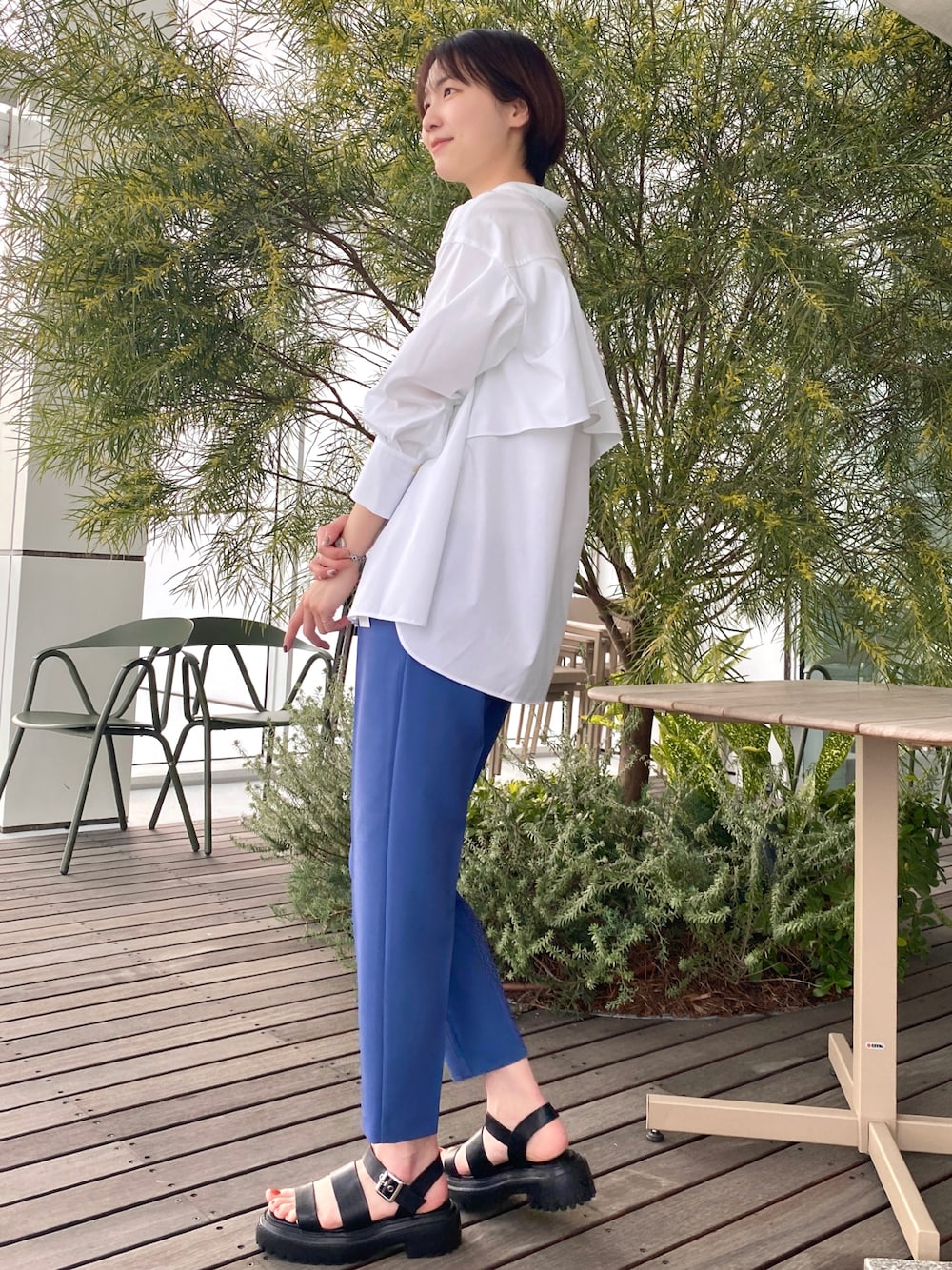 sachiko 174cm 背中のフリルがポイントのブラウス。 前はシンプルなので普段使いもしやすく、 ボトムスにも合わせやすい! 履き心地快適なテーパードパンツできれいめに。カラーパンツで春らしさを演出できます。