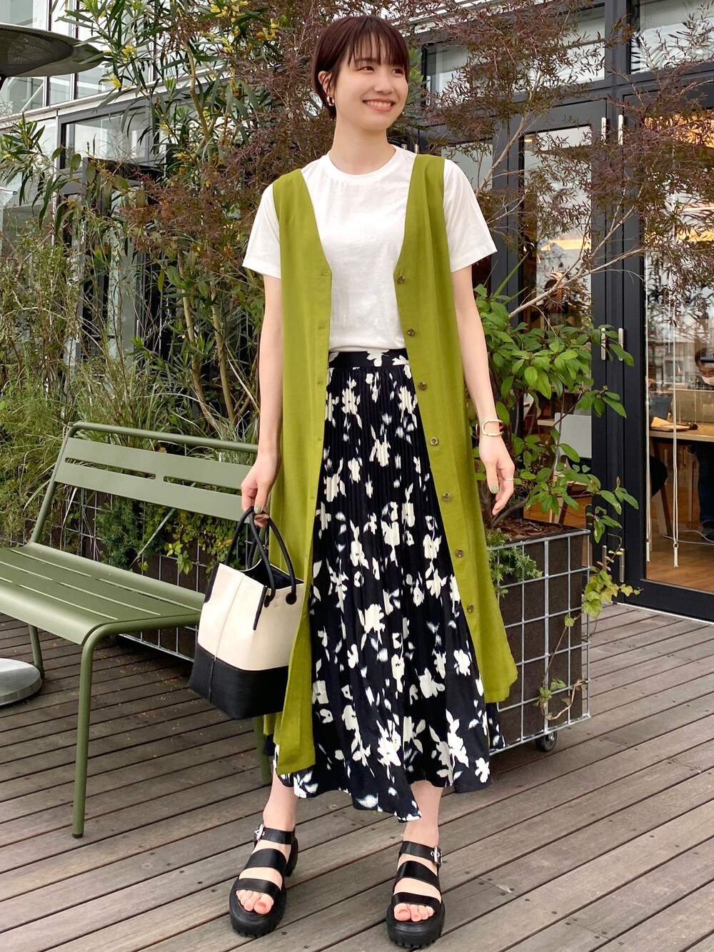 sachiko 174cm イエローグリーンが印象的で 一気におしゃれ見えするジャンパスカートは3wayで色々な着方ができます! 花柄のスカートとのコントラストが素敵に見えるようにベスト風に着るもよし、 ボタンを閉めてスッキリ見せるのも良し! その日の気分で色々なバリエーションを 楽しめますよ!