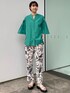 sachiko 174cm 目を惹くグリーンカラーのスキッパーシャツ。前後座がある裾デザインなので アウトスタイルもバランス◎! モノトーンのボタニカル柄がコーデの ポイントに! ウエストゴムなので履き心地も快適! 足のラインをきれいに見せてくれる 程よいゆとりのあるシルエットです◎