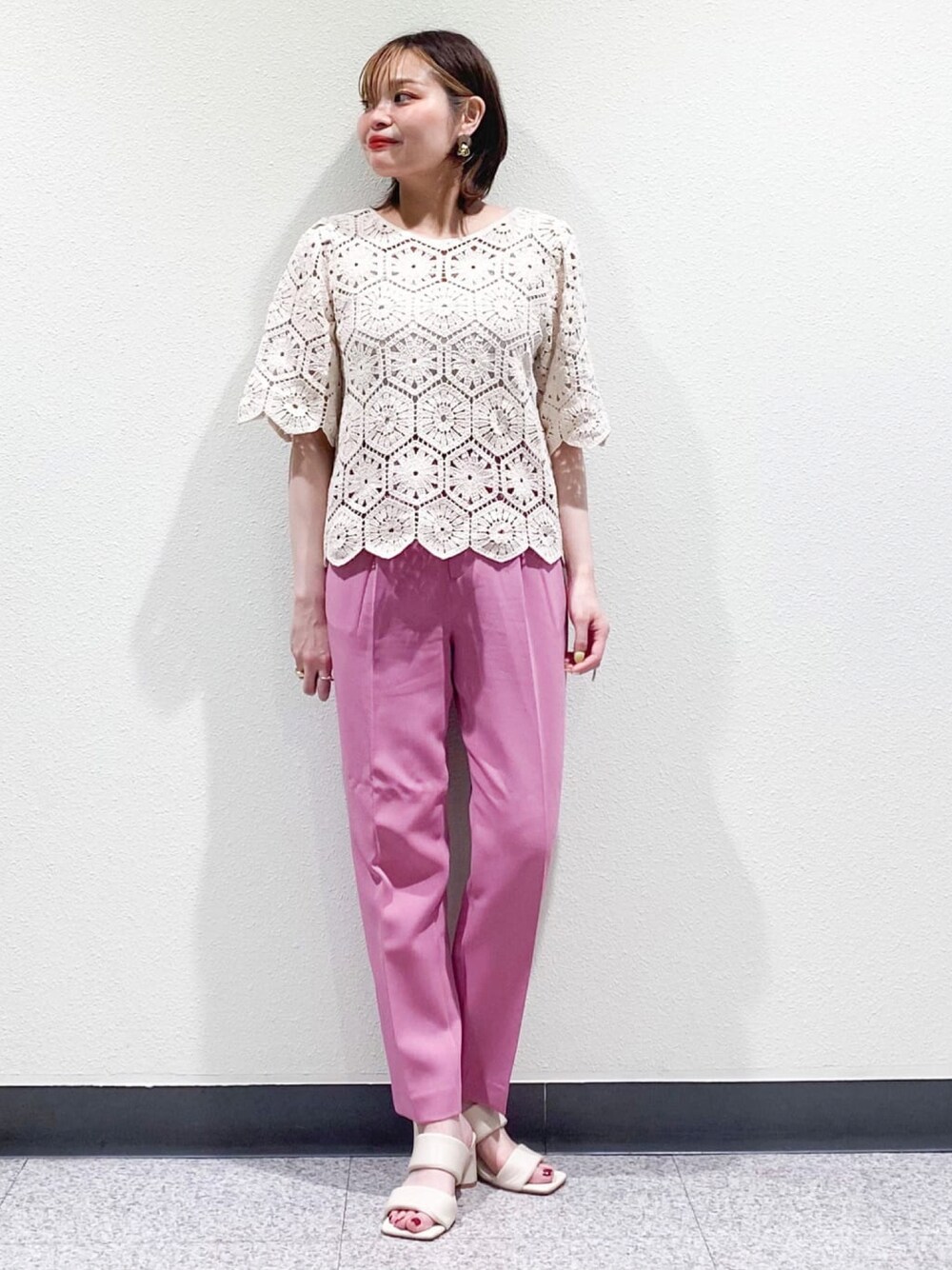 たわわ 154cm 新作のレーストップスを、カラーパンツで合わせて着用してみました。一枚で華やかさとトレンド感が出せて◎、二の腕やお腹周りもゆったりしていてカバー力もありです。こちらは、透けるトップスのため、同型色ベージュのタンクトップをインナーに着用しています。
