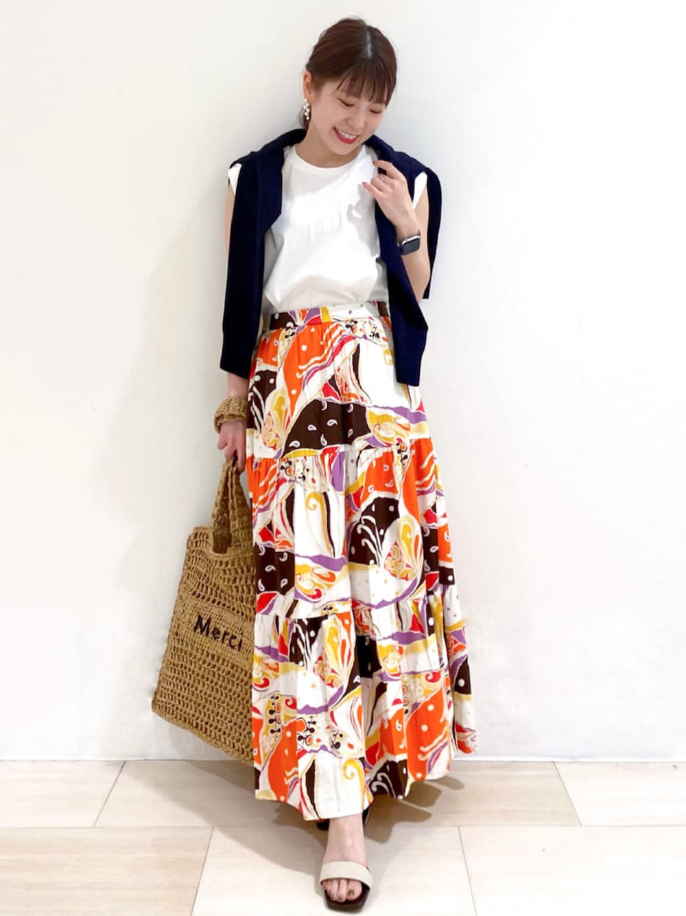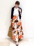 asari 154cm 立体的なシルエットと華やぐオレンジカラーが特徴のティアードスカートはシーズンレスなレディースコーデにおすすめな一枚! 白と黒のモノトーンを差して大人な印象を+し、リゾートカジュアルSTYLEに。