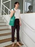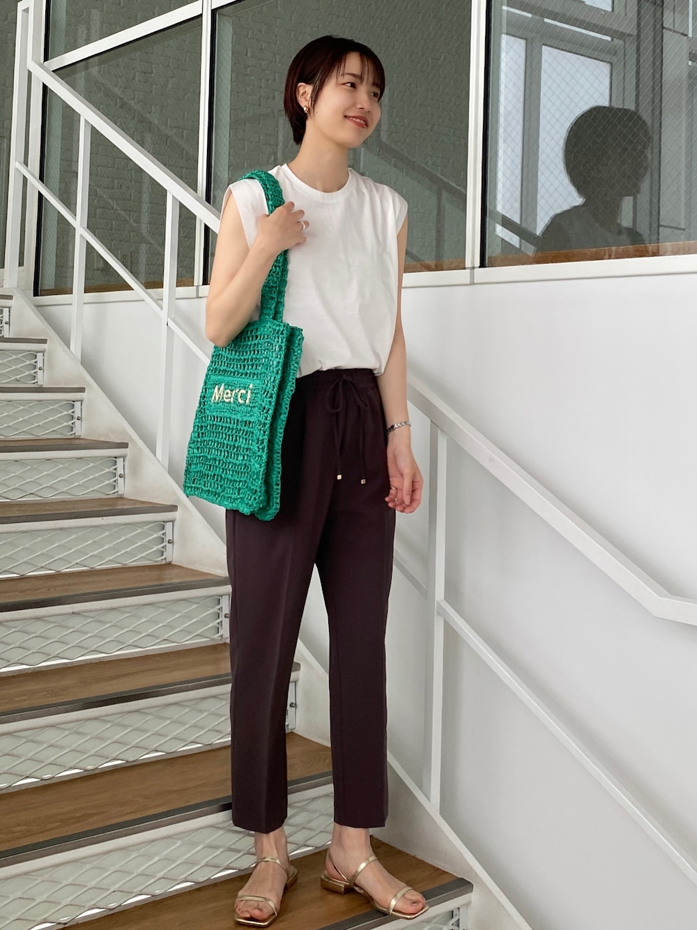 sachiko 174cm パンツはセンタープレスが入っていてきれいめ見え。履き心地の良さはもちろん夏にも快適な薄手の素材。 グリーンのバッグでコーデにアクセントを。 shoes:C71-24014 公式HPの検索🔍からご覧いただけます