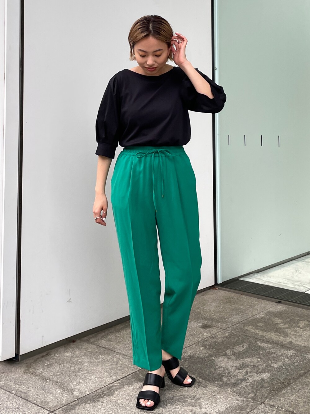 Haruka 159cm ブラック×グリーンのシンプルコーデ。 お仕事でも着られるようなスタイリングに仕上げました! ボリュームスリーブやセンタープレスデザインで シンプルながらディティールに拘りを! 足元はサンダルで夏っぽく! Instagram >> @haruka_ishizawa ぜひチェック・フォローお願いします♡
