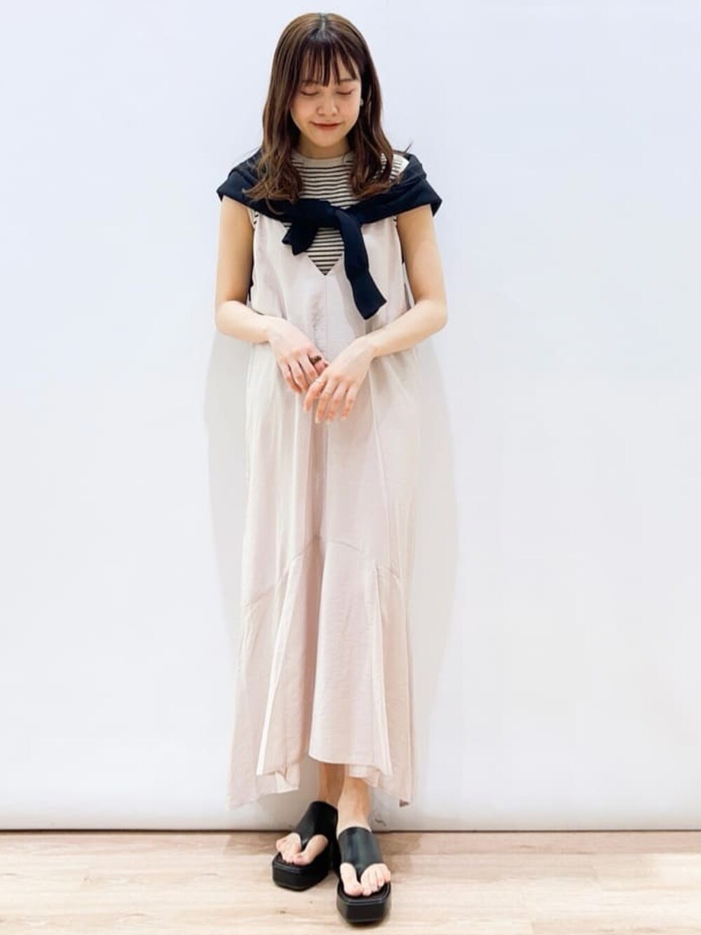 あやな 157cm ペプラムの切り替えデザインが魅力のキャミワンピース シルエットが女性らしくとても可愛いです^^ ボーダーのトップスと合わせてカジュアルに!