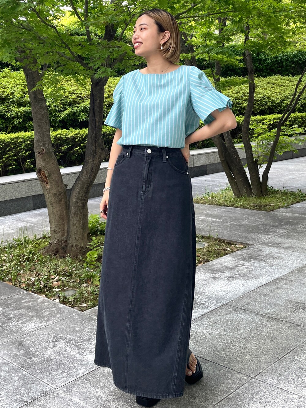 Haruka 159cm グリーンストライプのブラウスにデニムスカートで キレイめカジュアルコーデ! ブラウスのタックデザインとスカートのフレアシルエットで フェミニンらしさもあるコーディネートに! Instagram >> @haruka_ishizawa ぜひチェック・フォローお願いします♡
