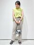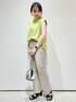 aya 151cm ネオンカラーのイエローグリーンが夏らしいトップスは、フレンチスリーブなので二の腕カバーができて1枚でも着やすいです☺︎ フレアパンツは、Sサイズ着用で太ももあたりはフィット感があります。 小物を黒で統一して大人っぽく。