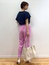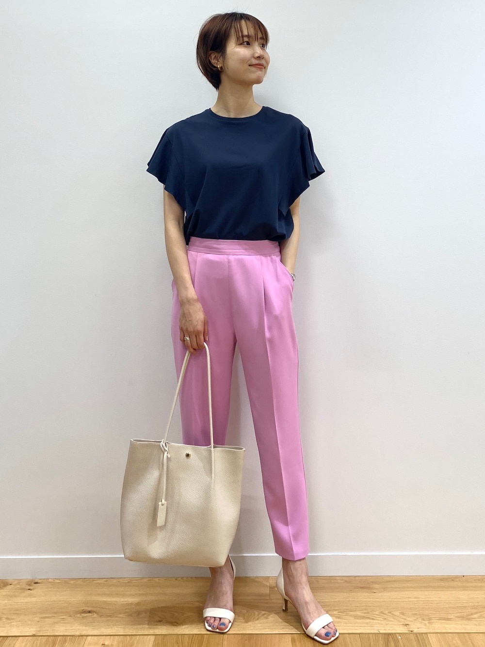 sachiko 174cm 袖のフリルデザインがポイントのトップス。 首周りもスッキリ、二の腕カバーにもなるデザインがこの夏重宝する1枚。 ベビーピンクのパンツと合わせて大人のカラーコーデに。