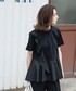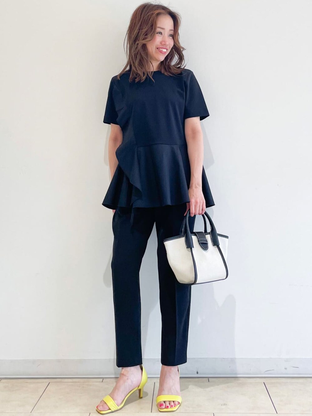 ともも。 158cm ペプラムシルエットにフリルが付いたカットソーは、縦に流れができ涼しげで華やかな印象に^ ^ 上下ブラック合わせでセットアップ風なコーディネートに^ ^ 足元にイエローをいれて、夏らしさをプラス! トップスもボトムもサラッとした少し光沢感ある素材で、普段着からお仕事着としても使えるアイテムです!