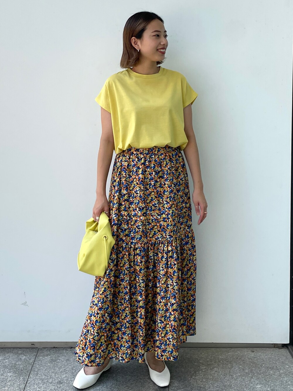 Haruka 159cm イエローのフレンチスリーブカットソーに 花柄のティアードスカートで 初秋まで着られるカラーコーデ。 Instagram >> @haruka_ishizawa ぜひチェック・フォローお願いします♡