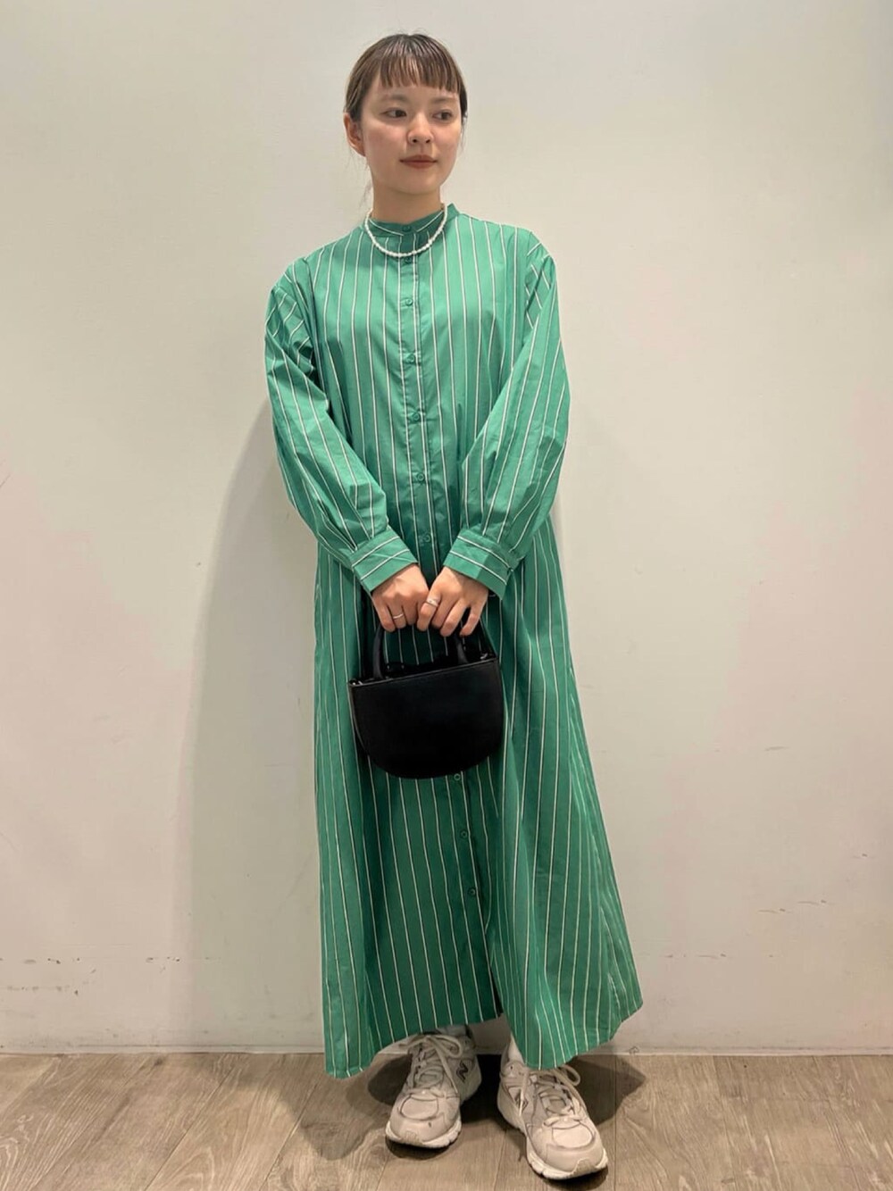 Misaki 155cm ワンピースのキレイめカジュアルスタイル! ストライプ柄でシャツ素材のカジュアルなワンピースにパールのネックレスを目立たせて、小ぶりのバッグでカジュアルになりすぎないように。 ラフで簡単なキレイめコーデです。