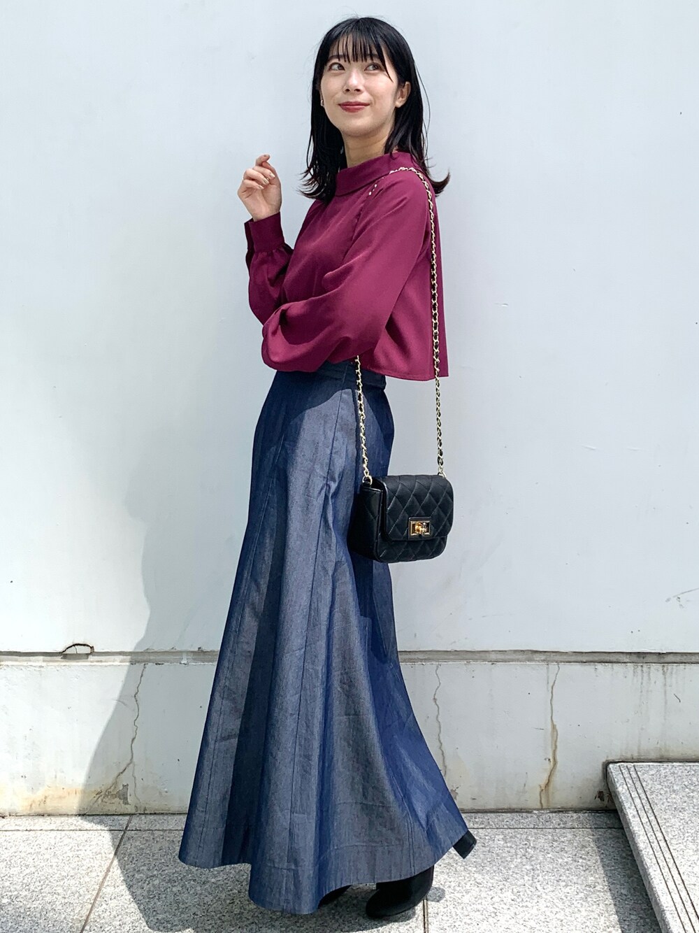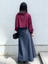 RINA 158cm 深みのあるパープルとネイビーで秋の高揚感感じるフェミニンコーデに。 ぶどうカラーのようなこっくりパープルはお洒落見えするのでおススメです◎ レイヤード風になっているので、インしてもショート丈風に楽しめますし、アウトでもトレンド感ある着こなしに仕上がるので、プラスワンするだけで普段のコーデがグッと格上げされます!