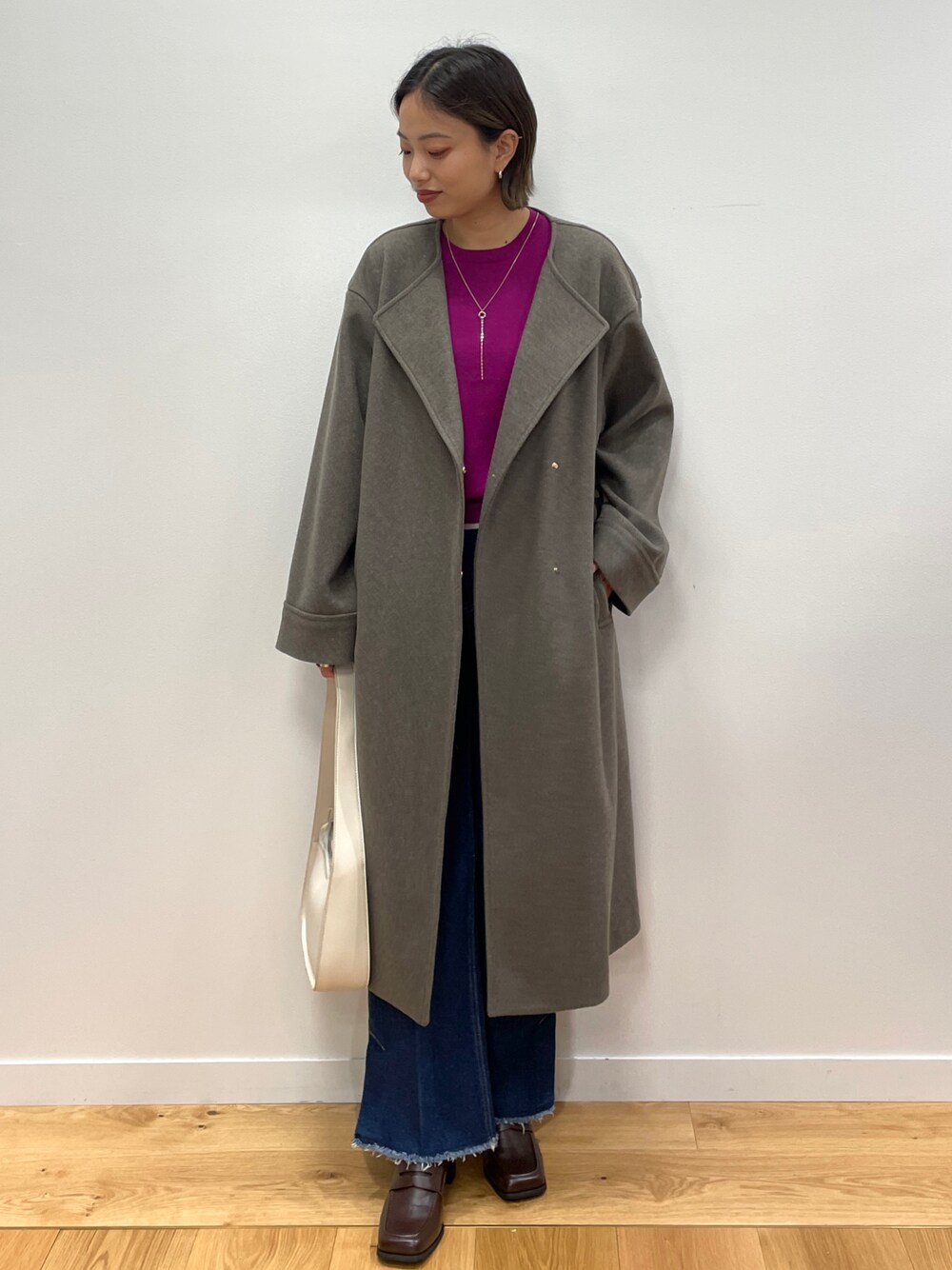 Haruka 159cm メルトン素材の軽い着心地のノーカラーコートを使った秋冬のカジュアルコーデ。 インナーに秋らしいカラーを取り入れ、他のアイテムはベーシックに、バッグをホワイトで軽さをプラスしました。 Instagram >> @haruka_ishizawa ぜひチェック・フォローお願いします♡