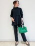 ともも。 158cm ペプラムトップスは、切り替えが上の方ありスタイルアップ効果◎ 上部は、ニットですがサラっとした肌触りです! バッグスタイルも切り替えがあり、後ろから見てもオシャレに着れます^ ^ パンツはストレッチ入りで、しゃがんだり立ったりも楽にできます! 上下ブラック合わせで、シックな装いに。 バッグをグリーンにし、コーディネートに華やかさをプラスしました^ ^