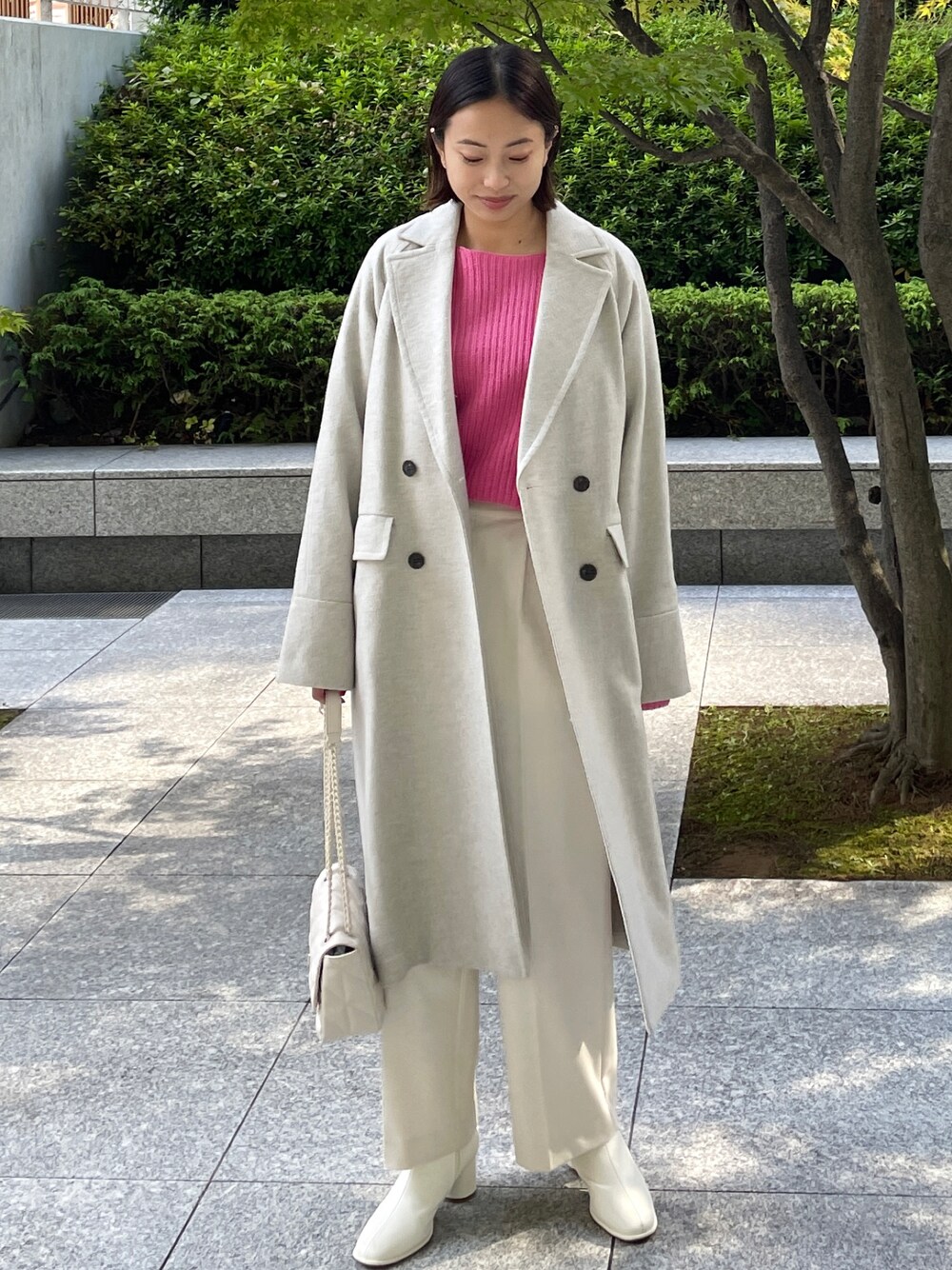Haruka 159cm ピンクのニットをポイントに、ホワイト系でまとめたキレイめカジュアルコーデ。 程よくゆとりのあるニットはふっくらとしていて存在感があり、秋冬の主役ニットになってくれます! 蓄熱素材を使用した、冬でも温かいパンツはワイドすぎない綺麗なシルエットで、ON/OFF使えます◎