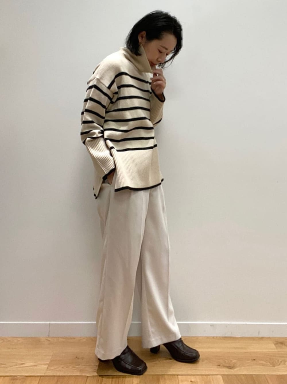 Fujisawa 160cm Cのボーダーニットを主役に、オフホワイト系のカラーでまとめた冬コーデです。 タートルネックのゆるニットは、コートを羽織った時のバランスもかわいいし、首元が隠れてとってもあたたかいので冬には欠かせないアイテム。 暗いカラーのボトムにも合いますが、オフホワイトのような薄いグレーのワイドパンツを合わせてワントーンコーデにしてみました。