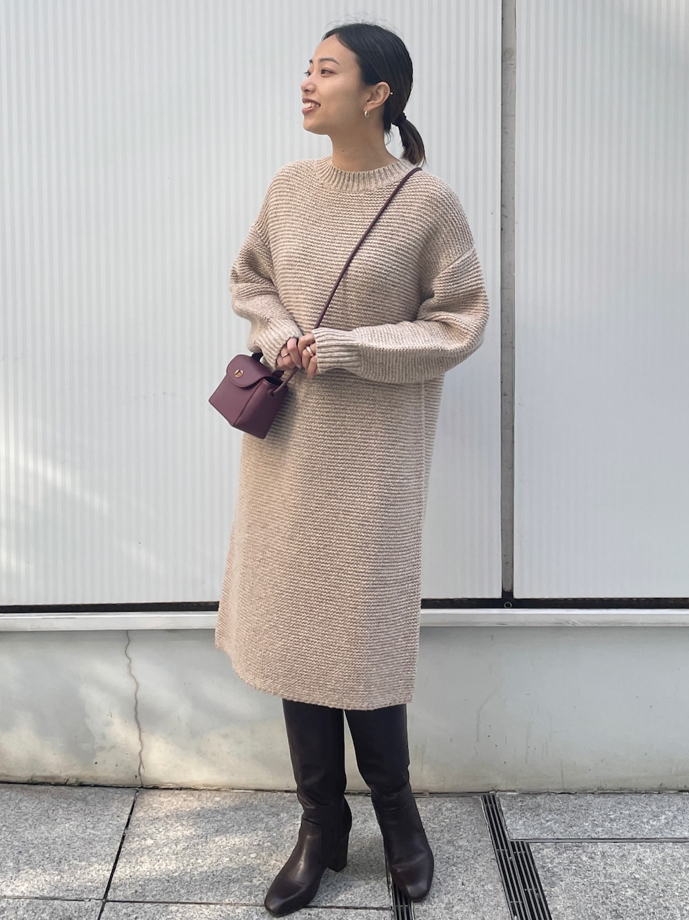 Haruka 159cm ラクチンなのにキマるニットワンピースで冬のあったかコーデ。 体のラインを拾わずゆったり着れ、膝にかかる着丈なので、ロングブーツを合わせて大人っぽく仕上げました。