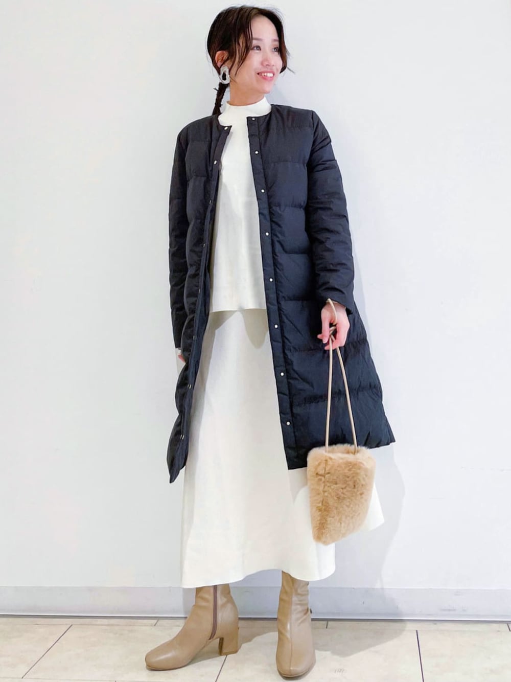 ともも。 158cm 着心地が軽いロングダウンは、ボリュームが出過ぎずスッキリ着れます^ ^ ロング丈で、縦のラインが強調されるので更にスッキリ見え◎ ノーカラーで、インに着るトップスのネックも選ばず着回ししやすいです! 同素材のトップス、スカート合わせてセットアップに^ ^ オフホワイトカラーのスカートは、透け感があるのでペチスカート着用がオススメです!