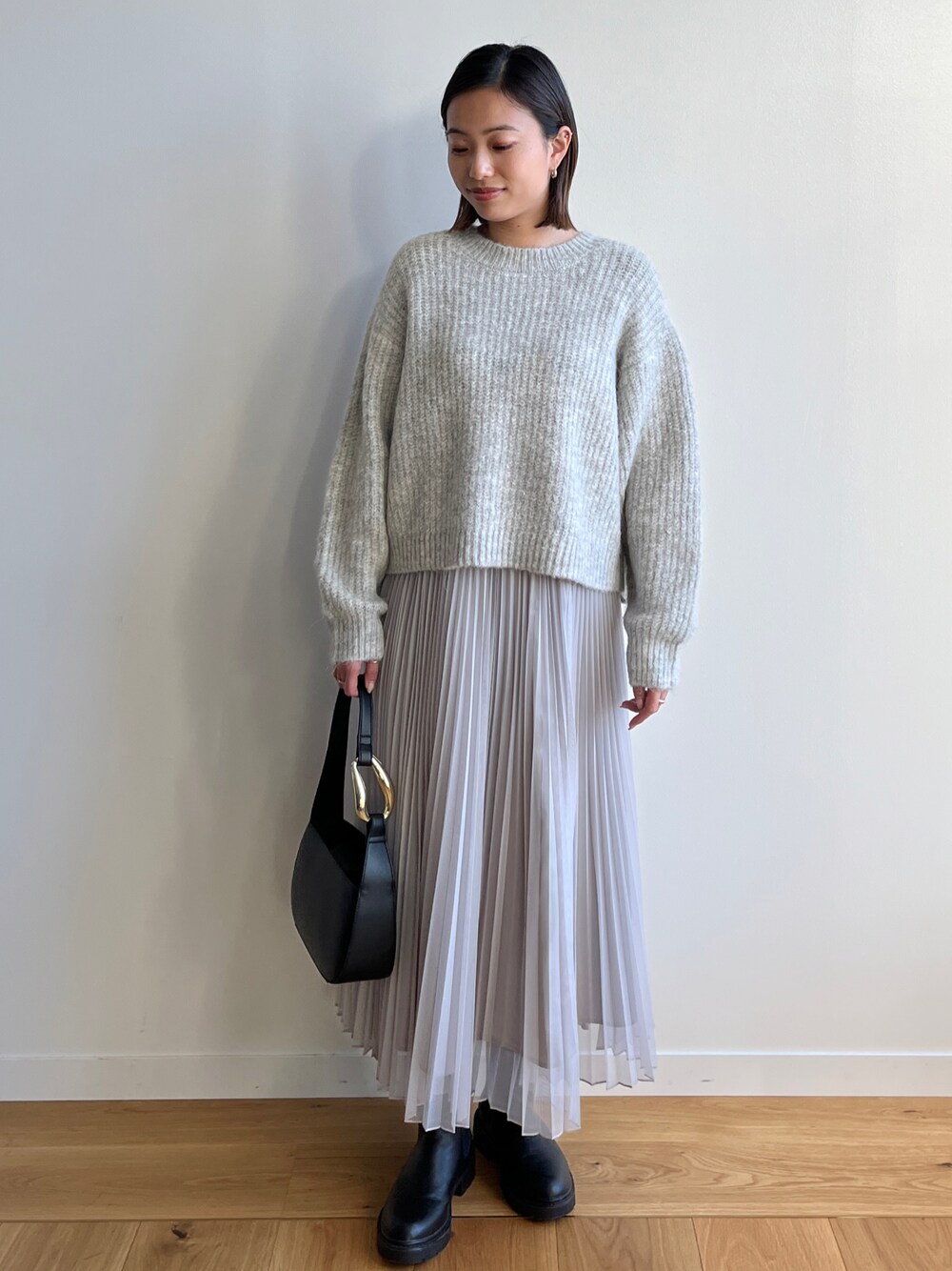 Haruka 159cm ゆったりシルエットのニットとプリーツスカートで春にかけて着られるモノトーンコーデ 着丈短めの暖かニットにキレイめなプリーツスカートを合わせて大人カジュアルスタイルに。 グレーのワントーンで合わせ、バッグとブーツはブラックで全体の締め役に。