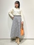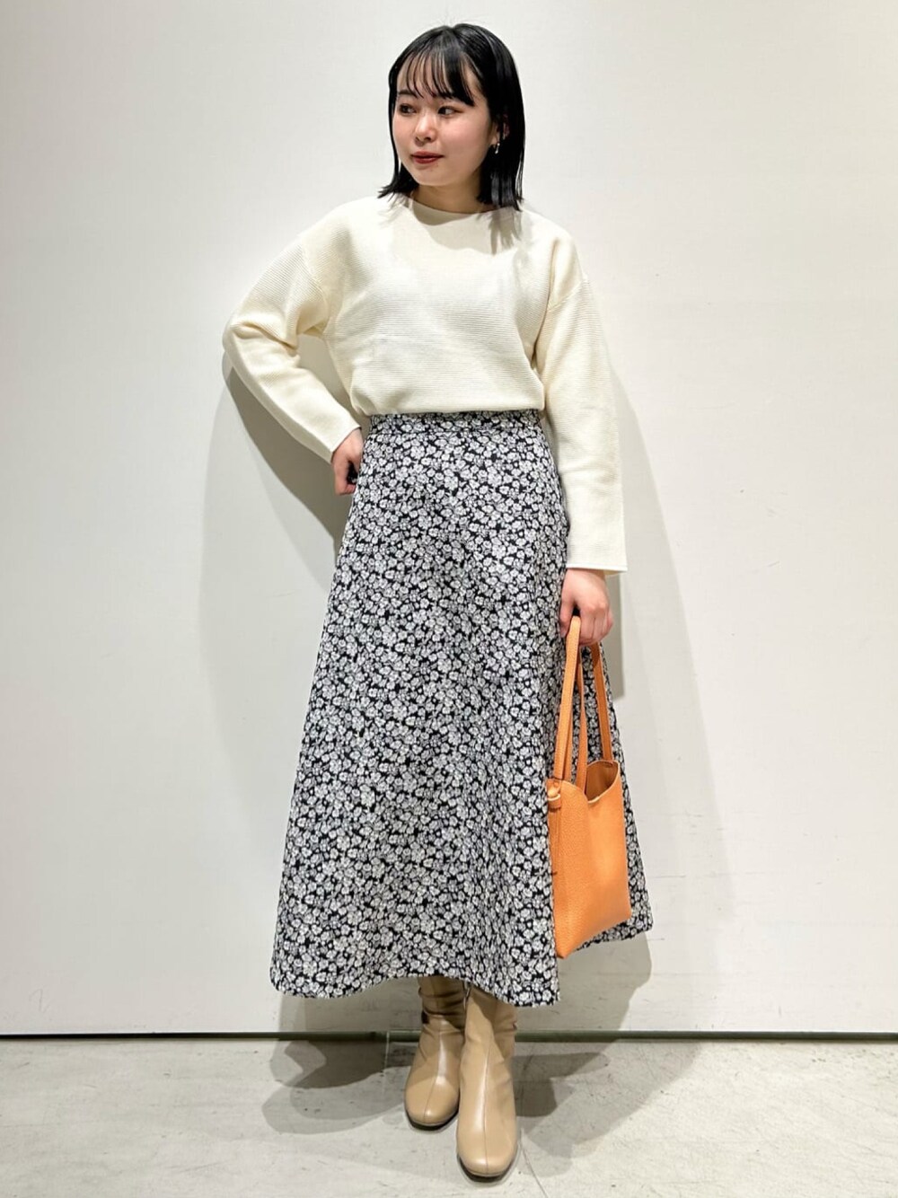aya 151cm 定番のボートネックニット、首元が開きすぎず1枚でも安心です。 ややゆとりを持たせた見頃と肩周りでラインを拾うことなく着れます。 花柄のスカートは、ハリ感がありふわっと広がるシルエットが女性らしくかわいいです。