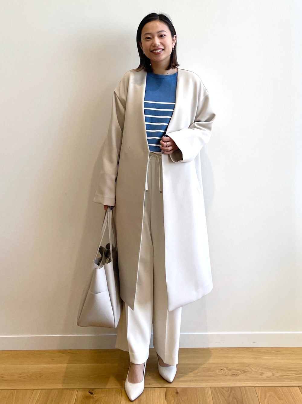 Haruka 159cm ボーダーニットを使った春の爽やかキレイめコーデ。 さっと羽織れるノーカラーコートに配色バランスがポイントのブルーニット、体のラインを拾いにくい履きやすいワイドパンツでキレイに仕上げました。 ヒールで通勤にも、スニーカーでカジュアルにも◎