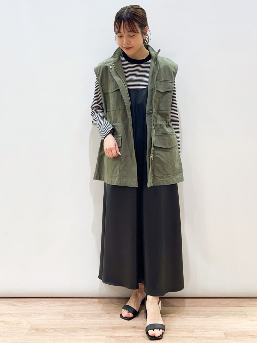 あやな157cm ベスト:637-46017 ミリタリーベストを主役にしたカジュアルスタイル! ベストは、羽織るだけで今年らしいコーデに! 様々なアイテムとレイヤードしやすいデザインで、着回し力◎ 上品な光沢感のあるワンピースとヒールを合わせて、女性らしさをプラス!