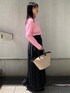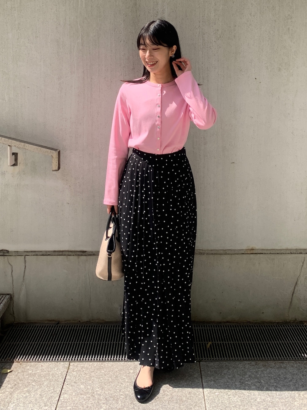 RINA 158cm ピンク×ドットスカートでフレンチフェミニンコーデ♪ 着心地と肌触りがいいカットソーのカーデザインなので、羽織としては勿論、1枚着でも快適◎ 同素材のTシャツとアンサンブルで着られます! 上品に揺れるプリーツスカートはジョーゼットの軽やかな素材で、いつものコーディネートをワンランクアップした着こなしに仕上げてくれます! 大草さんコラボのバレエシューズはクッション性もあって履き心地抜群!普段23.5〜24.0cmを履くことが多い私は、裸足でMサイズがぴったりでした◎