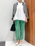 NAKA 161cm 毎年定番のペプラムカットソー♪ 鮮度アップコーディネートのご紹介です。 春夏らしくボトムはグリーンをセレクト。 細ボーダーのカーディガンを合わせることで、落ち着いた大人コーディネートに仕上げました。 足元はパンプスを合わせていますが、ローファーやバレエシューズなども相性〇