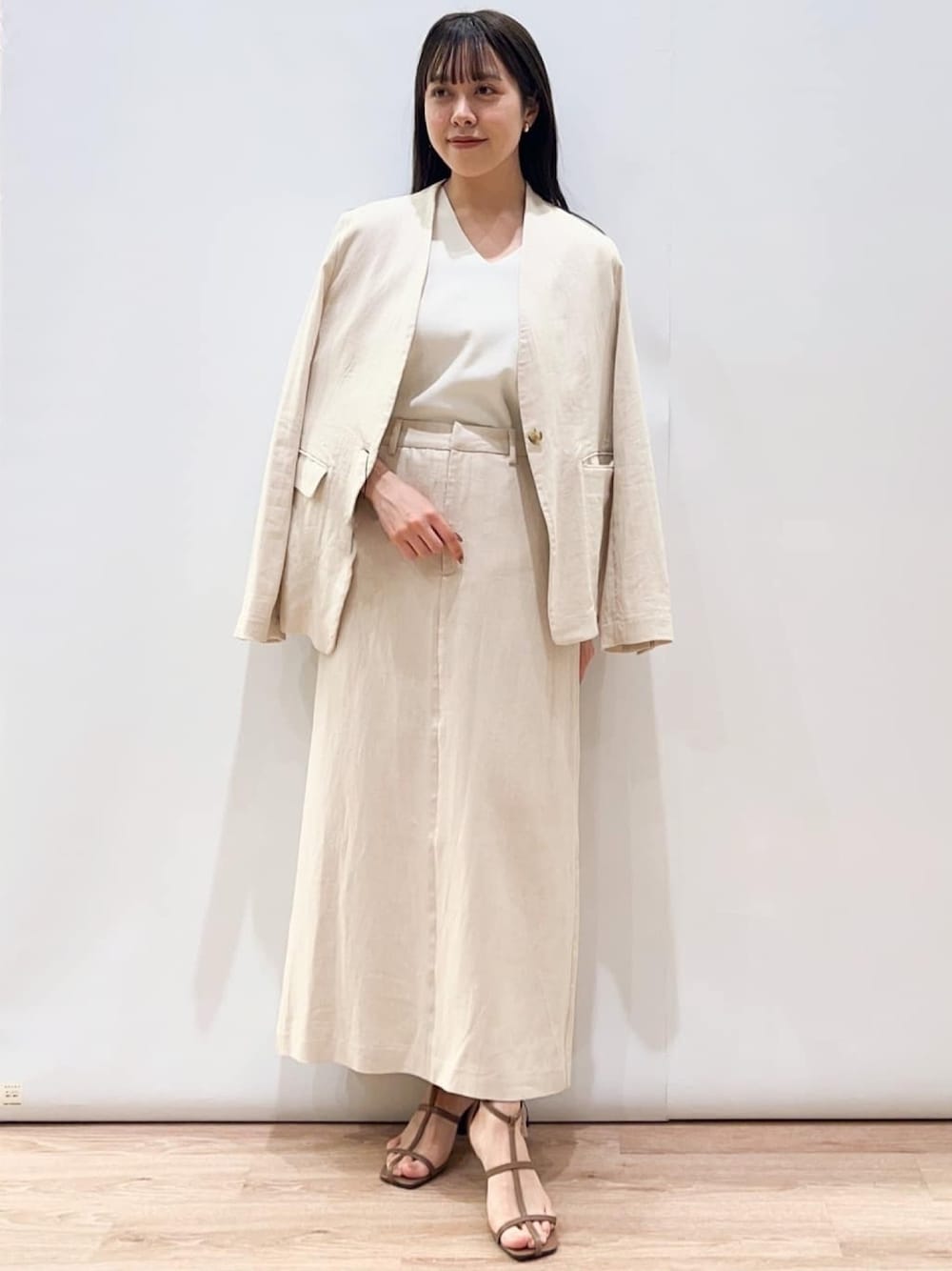 あやな 157cm リネン混素材で作られたセットアップ! 通勤着にもカジュアルシーンにも対応できるVネックジャケットは、スッキリとしたシルエットで様々なアイテムとも合わせやすいです^^ スカートは、シンプルなデザインでトップス次第で様々な着方が楽しめます♪ やや大きめなサイズ感で、小柄な方はSサイズがオススメです!