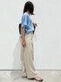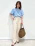 yuka.a 159cm 甘くなりすぎない袖フレアブラウスは爽やかなブルーストラップを選びました^ ^ フレア袖ですが柔らかな素材感で広がりすぎず、キレイめカジュアルコーディネートにピッタリです! 写真4.5枚目はボトムから出して着用しましたが、バランスの取りやすい丈なのでワイドパンツに合わせても重たくならずにスッキリとお召し頂けます。 合わせたパンツは滑らかな落ち感がキレイなワイドパンツです。 マリンボタンがポイントになり、インして着た際のデザイン性◎です^ ^!