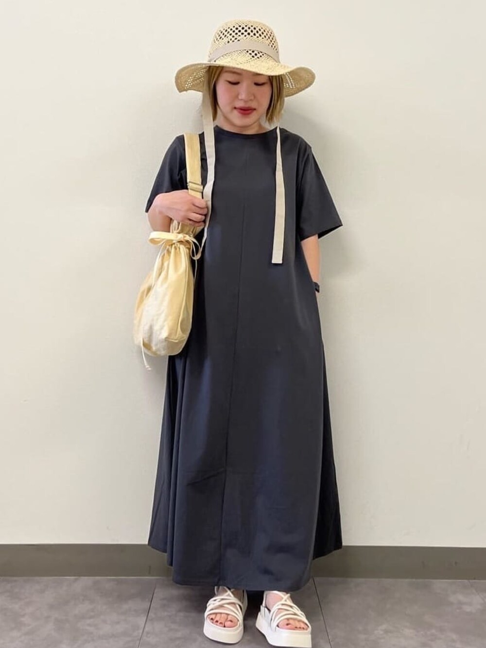 くーみー 153cm 子供と公園おでかけコーデ Tシャツ生地で着心地抜群! 着て楽なのにAラインでシルエット綺麗でポケット付きは忙しいママには助かるワンピースです。