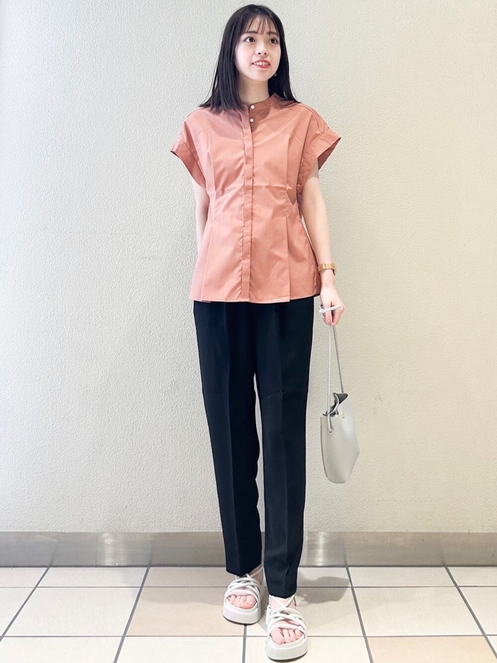 rucha 162cm ペプラムシャツブラウス^ ^ ウエストタックですっきり! 裾にかけてフレアなシルエットに♪ ドロップショルダーなので腕周りのカバーも◎ キレイめなパンツと合わせて通勤スタイルにも、デニムと合わせて上品なカジュアルなスタイルにも着回しできます♪ シワになりにくい【エステネージュ】素材を 使用しているのでお手入れも安心です^ ^