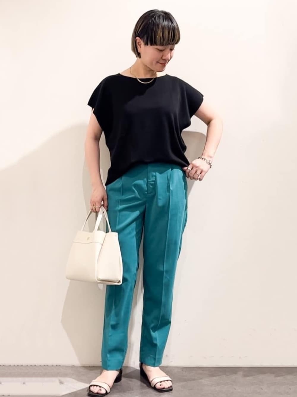 chiaki 156cm ノースリーブよりスッキリ!? こちらのトップスはシアー感のある素材なので黒でも涼しげに着こなせます! 袖丈もフレンチなので程よく二の腕周りをカバーしてくれます♪ 少しトーン抑えめのカラーパンツならオフィスカジュアルとしてもこなれ感が出せますね。