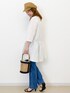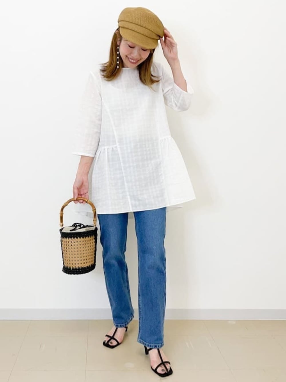 Aki 157cm チェック柄ペプラムブラウスはお尻がかかるためパンツ合わせに◎です!! 初夏らしいシアーな素材感は爽やかに着こなせれます!! インナーを色で合わせていただければ透け感は気にせずきていただけます!!
