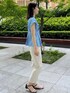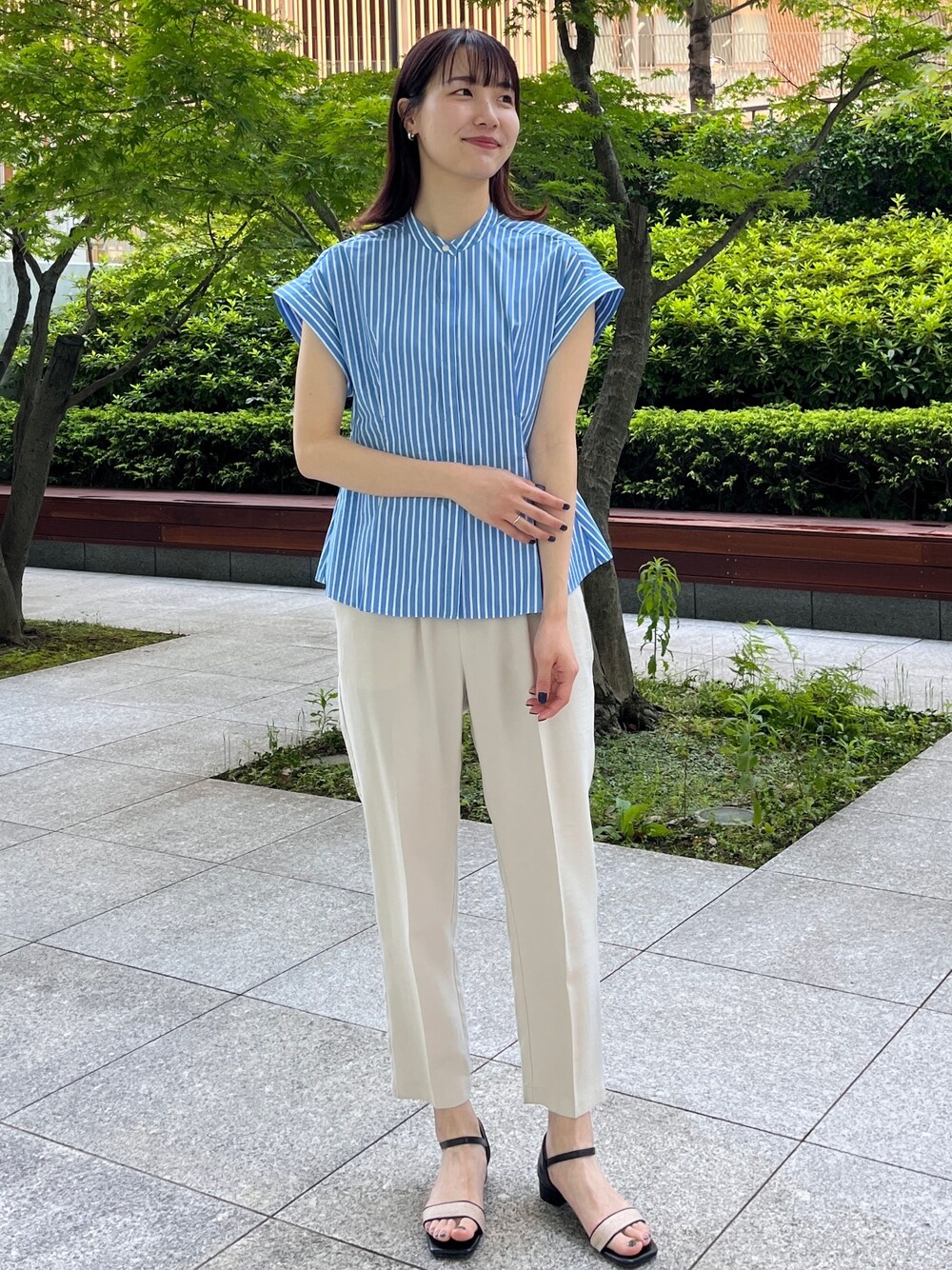 sachiko 174cm 骨格ナチュラル / ブルベ冬 【スタイリングポイント】 ブルーストライプのブラウスに 明るいカラーのパンツをあわせた 爽やかなコーディネートに。 【おすすめポイント】 爽やかなブルーストライプのブラウス。 高めの位置にタックデザインが入っているのでスタイアップ効果が期待できる1枚。 どの角度から見てもきれいなシルエットが ポイントです! 【着用感】 上下とも締め付け感がなく、 着心地快適です◎ 【サイズ感】 Mサイズでジャストなサイズ感でした。 タックが入っている部分は、 ゆるめになっているので締め付け感は ないです。 パンツは、Mサイズでちょうど良かったです。 丈感はくるぶしが見える長さで スッキリ見えします。