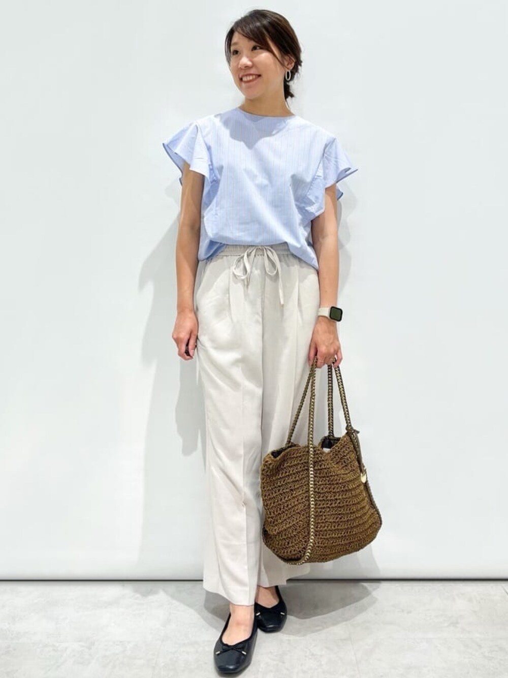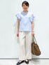 yuka.a 159cm 【サイズ感】 トップス:Mサイズ着用でややゆとりあり。 ボリューム感のあるフリルデザインですが着膨れや肩もがっしりとせずに、お召し頂けます。 パンツ:ウエストゴムタイプで、長さも足首がちょうど隠れるすっきりな丈なので、どんな身長の方にもオススメです^ ^ 【素材感・着心地】 トップス:程よいハリのある生地なので、立体感のあるデザインも着るだけできれいなシルエットを保ってくれます^ ^ パンツ:柔らかくストレッチの効いた履き心地◎なパンツです^ ^! ウエストゴムで締め付けなくお召し頂けます。 【おすすめポイント】 フリルブラウスは着るだけで華やかな印象に仕上げてくれます。 ボリューム感のあるフリルデザインですが、甘くなり過ぎない大人かわいいブラウスです^ ^! 【コーディネートのポイント】 爽やかなブルーのブラウスを主役に、楽ちんですがキレイ見えするコーディネートです^ ^! 甘くなりすぎない清潔感のある色合わせで、お出かけからお仕事まで、万能なオススメコーディネートです^ ^!