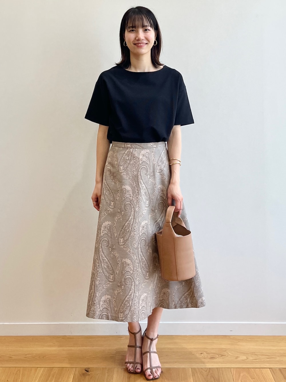 sachiko 174cm 骨格ナチュラル / ブルベ冬 程よくゆとりのあるシルエットながらすっきり見えするトップス。 アウトもインもしやすい生地感でこの夏1枚で快適に過ごせるアイテム! 二の腕が隠れる袖丈もおすすめです。 フレアスカートは、どの角度から見てもきれいなシルエットが一押しポイントです、 ペイズリー柄がナチュラルで大人な着こなしに◎ バック部分がゴムになっているので、はき心地も快適です。