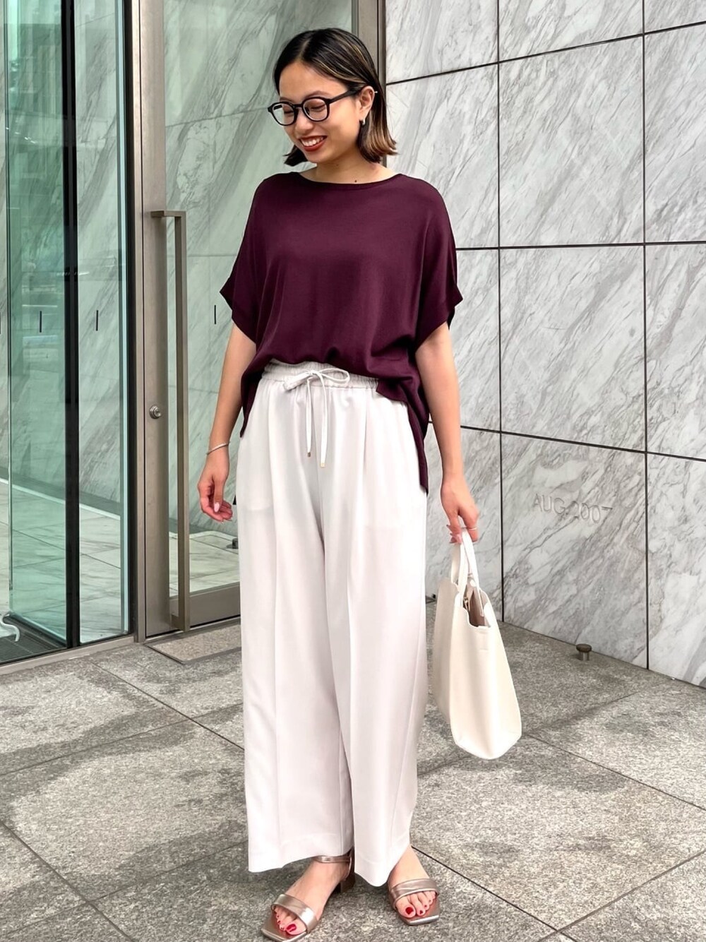 Haruka 159cm 体型カバーも叶う!マルチな機能が付いたトップスでキレイめコーデ ■トップス さらっとした素材で、着た時にひんやりする接触冷感機能付きのドルマンスリーブニット。 二の腕や腰回りの気になる部分をカバーできるのに快適なので、とても着やすい1着です! ■パンツ 暑い日でもさらっと履けるイージーワイドパンツ。ウエストゴムでラクチンなのに、キレイめ素材なので通勤にもおすすめです◎ Mサイズでレングスもジャストで、フラットシューズでも着丈ぴったりで履けました!