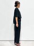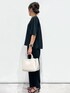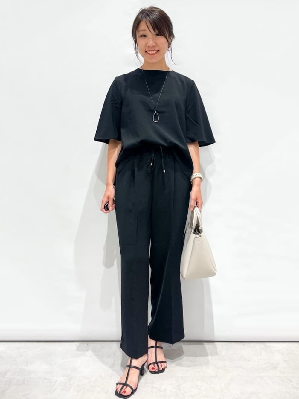 yuka.a 159cm 【サイズ感】 トップス:Mサイズ着用でジャストサイズでした。 襟ぐりの開きは狭めですが詰まった感じはしません。 背中のタックデザインでフレアになっているのでゆとりを持ってお召し頂けます。 パンツ:159cm、Sサイズ着用でくるぶしにかかる丈でした。 ストンとした広がり過ぎないワイドシルエットが脚をすっきりキレイに見せてくれます! 【素材感・着心地】 マットめな質感で高級感があります。 ストレッチが効いているので動きやすく着心地も◎です。 パンツのウエストはゴム仕様なのでとても快適です! 【おすすめポイント】 大人気セットアップシリーズのフレアスリーブブラウスver. シンプルに見えて背中のタックやフレアスリーブがおしゃれポイント! 【コーディネートのポイント】 ブラックのセットアップに大きめモチーフトップのネックレスをポイントに! きちんと感があるので、お仕事や学校行事にもオススメです!