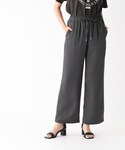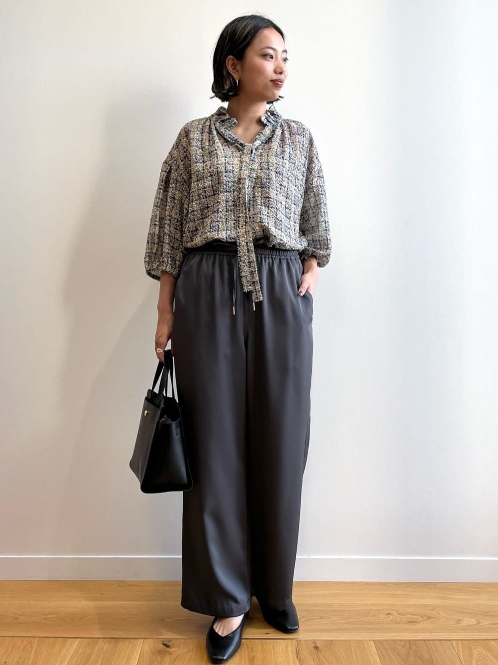 Haruka 159cm 【サイズ感】 上下共にMサイズを着用しています! ブラウスはゆとりのあるシルエットで身体のラインを拾いません! パンツはウエストも着丈もジャストですが、ウエストゴムでゆとりもあり、着丈も少し長めのイメージだったので、すっきり着たい方は普段履いているサイズよりひとつ落としても良いかもしれません! 【素材感・着心地】 ブラウスはツイード風のオリジナルプリントで、柔らかく表面感のある素材です。 パンツは少し光沢のある素材で、さらっと着られます。ウエストゴムなのでとてもラクチンです◎ 【おすすめポイント】 他ではあまり見ないデザインブラウスで、ボウタイもお好みで結び方を変えられます!合わせるボトムや着たいイメージで変えて、スタイリングを楽しめる1枚です♪ 【スタイリングポイント】 主役になるデザインブラウスに、ベーシックなカラーのワイドパンツを合わせて通勤にも着られるスタイリングに! バッグと足元はブラックで全体を締め、バレエシューズで足の甲を見せて重たくならないように仕上げました!
