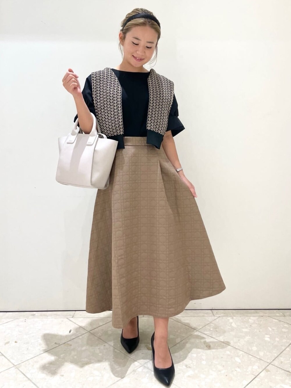 あかね 158cm 大人オフィスコーデ♪ 【サイズ感】 トップスは全体的にゆったりとしたシルエットです。袖口にスリットが入っているため、締め付け感もなくストレスフリーです♪ 【素材感・着心地】 トップスはシルクのような柔らかな肌触りと、光沢感のあるキレイな表面感◎ スカートはハリ感があり、Aラインシルエットで形がすごく綺麗です!履くと気分が上がるスカートです^^ 【おすすめポイント】 アームホールを深く取ったボリュームスリーブがポイントです!一枚でコーデが決まります♪ 【スタイリングポイント】 Aラインスカートなのでお仕事でもお使い頂けます^^パンプスで大人キレイめコーデにしました^^