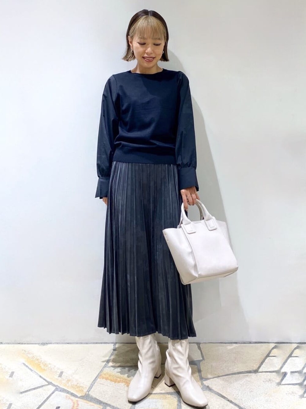 rie 163cm 【サイズ感】 トップスは普段着用サイズで丁度良いです。裾を出してもスッキリと着れます。 スカートもMサイズで丁度良いです。ウエストの締め付け感も全くありません。 【素材感・着心地】 トップスは、さらっとした肌触りです。袖部分のシャツ地も程よいハリ感です。 スカートは、とても軽く、柔らかい素材です。 【おすすめポイント】 プリーツスカートは、カジュアルにも綺麗目にも合わせて頂けるデザイン。歩いた時にプリーツが綺麗に揺れます。 【スタイリングポイント】 モノトーンでまとめた大人カジュアルスタイル。プリーツスカートの控えめな光沢がより際立つように、トップスをブラックで合わせました。