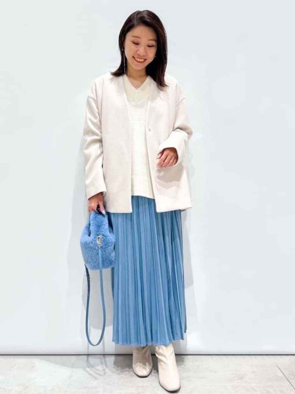yuka.a 159cm 【サイズ感】 アウター:中に着るお洋服を選ばずサッと羽織れる、ゆったりサイズが◎! ミドル丈でどんな身長の方にもバランスが取りやすく、長さはヒップラインまであります。 トップス:ワイドなシルエットでゆるっとした抜け感があります。 ブラウスやカットソーなど、インナーを中に着る余裕もあり、重ね着もお楽しみ頂けます^ ^ スカート:長さはしっかりめで、159cmで足首上くらいの丈です。 ストンとした広がらないシルエットなので重たくならず、すっきりとお召し頂けます。 【素材感・着心地】 アウター:ストレッチの効いたジャージー素材でとても着心地よく、動きやすさも◎です^ ^ 裏地がないぶん、とても軽く気軽にお使い頂けます。 トップス:ふんわりとしたニット生地で寒くなるこれからの時期にぴったりなお素材です。 スカート:滑らかで落ち感のあるフェイクスエード素材のお作りです。 動きに合わせて揺れる軽やかさが◎! やや光沢があるのでキレイめな印象です。 【おすすめポイント】 ゆったり快適なシルエットですが、ノーカラーのVネックでスッキリ見えが叶うアウター^ ^! スカートにもパンツにも、そしてボトムのシルエットも選ばず羽織れる万能アウターです! 【コーディネートのポイント】 冬のホワイト×ブルーのコーディネート。 上品で知的な印象になるお色合わせです^ ^ 温かみのある素材で季節感を出し、スッキリ見えるシルエットを意識しました^ ^
