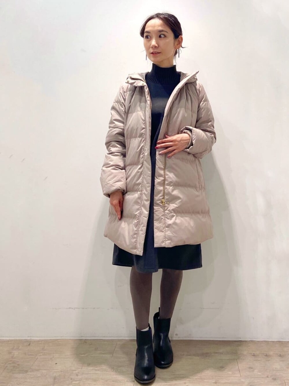 yuicci 156cm 【サイズ感】 ダウンコートMサイズ着用。すっきりとしたシルエットで、程よい着丈のミドル丈ダウンコートです♪♪袖口にリブがありジャストサイズで着ていただけます(^^) ワンピースMサイズ着用。ほどよいシルエットで着ていただけます(^^)長過ぎない着丈になっています♪156cm、膝が隠れる丈感です♪ 【素材感・着心地】 良質なダウンを使用することで、保温性は確保しながらあたたかく軽く着心地抜群です(^^) ほどよく厚みのあるジャージ素材のワンピースです(^^)身体に張り付かない、ストレッチ性のある素材なので着心地抜群です♪♪ 【おすすめポイント】 ご家庭でお取り扱いしていただけるマシンウォッシャブルのダウンコートです♪♪ ネックから肩、袖口にかけて配色のリブ素材をドッキングのデザイン性のあるワンピースです(^^) 【スタイリングポイント】 ベージュのミドル丈ダウンコート×配色のリブがポイントのワンピース×サイドゴアのショートブーツを合わせた秋冬にピッタリなスタイリングにしました(^^)