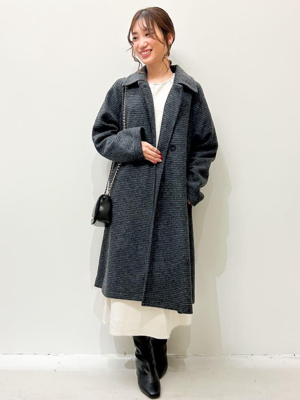 akky 157cm 【サイズ感】 コート...Mサイズ着用. 全体的にゆとりのあるシルエットでした.•♬ ワンピース...Sサイズ着用. ほどよくゆとりがあり157cmですねくらいの 長さでした.•♬ 【素材感・着心地】 コート...ほどよい厚みとボリューム感がありながら 軽やかに仕上がるスライバー素材です! ワンピース...ウール調のポリエステルを使用した膨らみ感のある素材です! 【オススメポイント】 コート...どんなコーデにも取り入れやすい さりげない千鳥柄のデザインです! ワンピース...配色ステッチがポイントに☆ 【スタイリングポイント】 モノトーンでコーディネートしました♫ 千鳥柄のコートがアクセントに♫