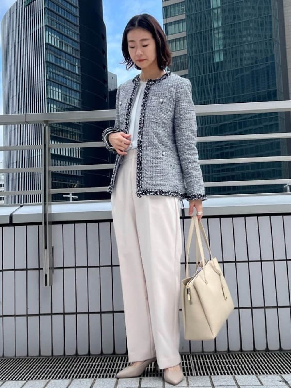 OPAQUE.CLIPスタッフ(OPAQUE.CLIP)のノーカラージャケット「◆≪通勤・セレモニー/セットアップ対応≫ コットンツイードミドルジャケット」を使ったコーディネート