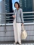 NAMI 161cm ハレの日style! 【スタイリングポイント】 毛足の短い共布のフリンジテープをあしらい、ツイード素材を活かした華やかなジャケットにストレートパンツを合わせたハレの日スタイル。 【おすすめポイント】 通勤にも使える万能ジャケットはデニムを合わせればカジュアルなデイリースタイルにも! 【サイズ感】 ジャケットの着丈は長め。普段Mサイズ着用ですが身幅に少しゆとりがあったため、Sサイズを着用しました。 【素材感・着心地】 パンツは素材メーカー、DELEGANT(デレガント)社の良質で仕立て映えのするダブルクロス素材を使用。